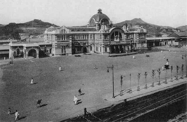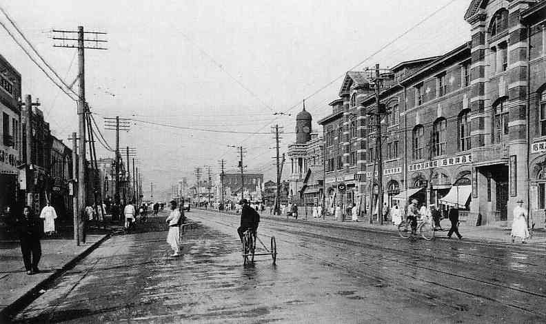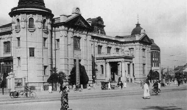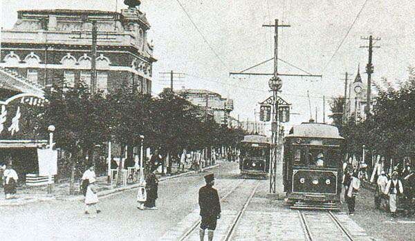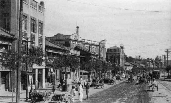 ▼1936 年の南大門通り|左が商業銀行、電車は複線である