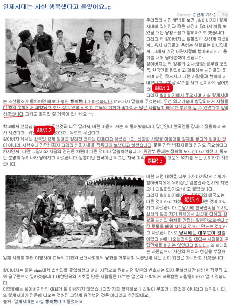 翻訳1:おじいさんは笑いながら「日帝時代は朝鮮王朝が統治した時よりはるかに幸せだった」と言いました。その例としてまず、医療技術が発達し人々が病気の苦痛から開放され長生きすることができるようになったこと、さらに教育の機会が与えられ、多くの人たちが勉強できるようになったことなど....