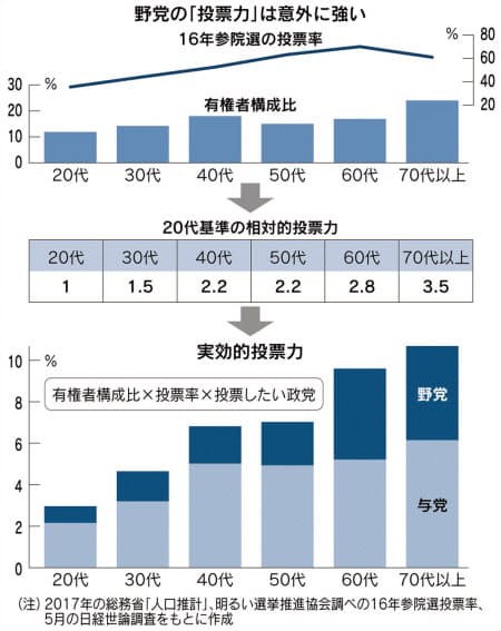 20代は与党が2.1で、野党の0.8を圧倒する。50代までは与党に野党の倍以上の投票力がある。ところが60代は与党5.2、野党4.4と肉薄し、70歳以上も与党6.1、野党4.5とけっこう近づいてくる。