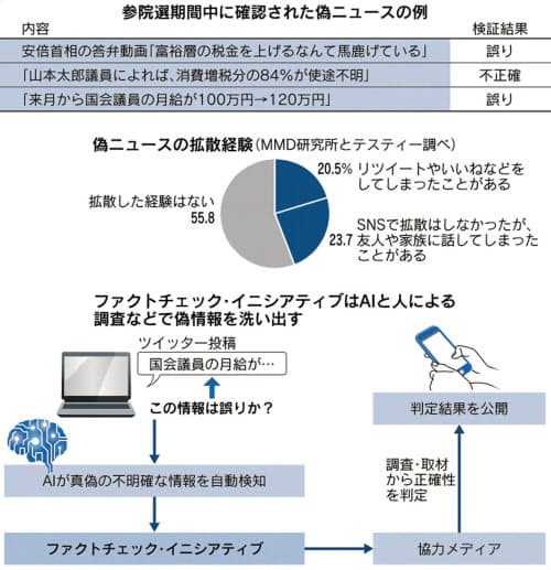 国内では、推進団体のファクトチェック・イニシアティブ(FIJ、東京・千代田)を中心にした取り組みがある。ネット上に出回る情報のうち「誤りなのでは」といったコメントがついたものをAIで自動抽出。協力するメディアが取材や調査をして事実確認する。今回の参院選期間中に出回った真偽不明の情報は50件を超えたという。